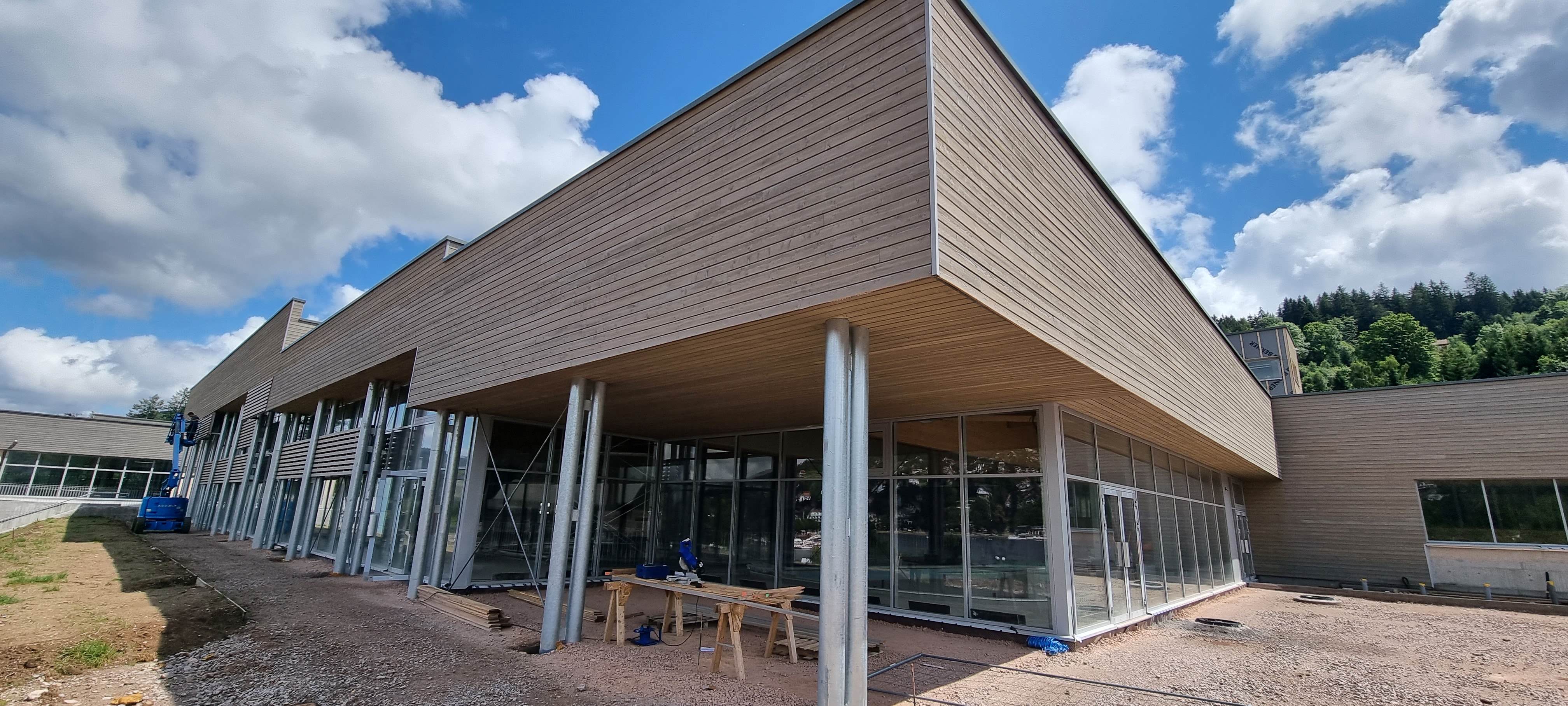 Les travaux sur le complexe aquatique et de bien-être à Gérardmer avancent. Malgré un hiver enneigé, le chantier se poursuit, les ossatures ont été entièrement posées et le bardage commence à prendre place.